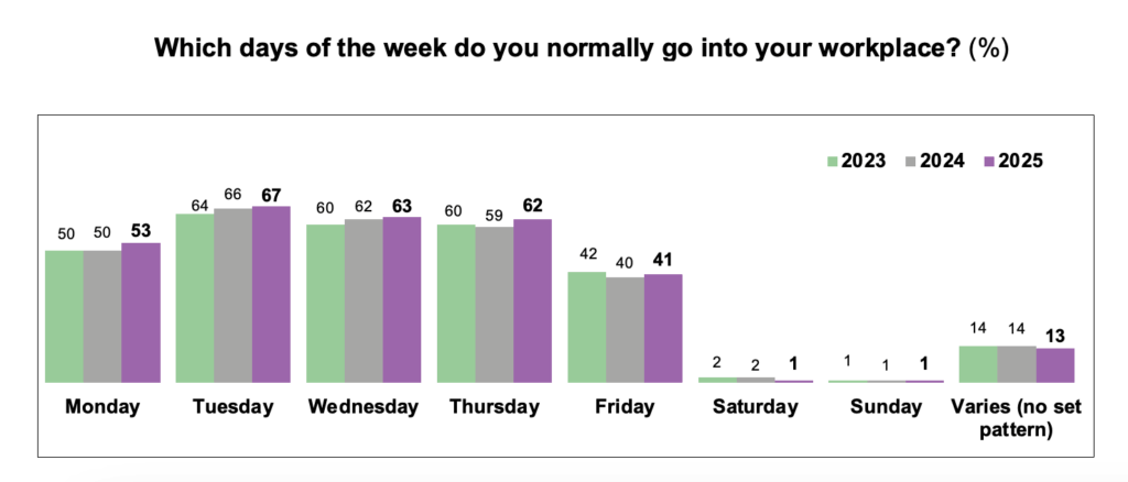 2.2 Midweek is when the majority of people are going into the office. Tuesday is still the busiest day with 67% (up from 66% in 2024) and Friday is still the quietest with 41% (up from 40% in 2024 but down from 42% in 2023).