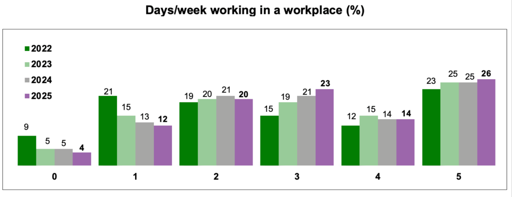 1. The % of people spending the majority of their time at their workplace continues to increase. 70% of respondents say they are spending the majority of their working hours at a workplace while 28% are spending the majority of their working hours at home. In 2024 the figures were 65% and 32% respectively and in 2023 they were 64% and 33%