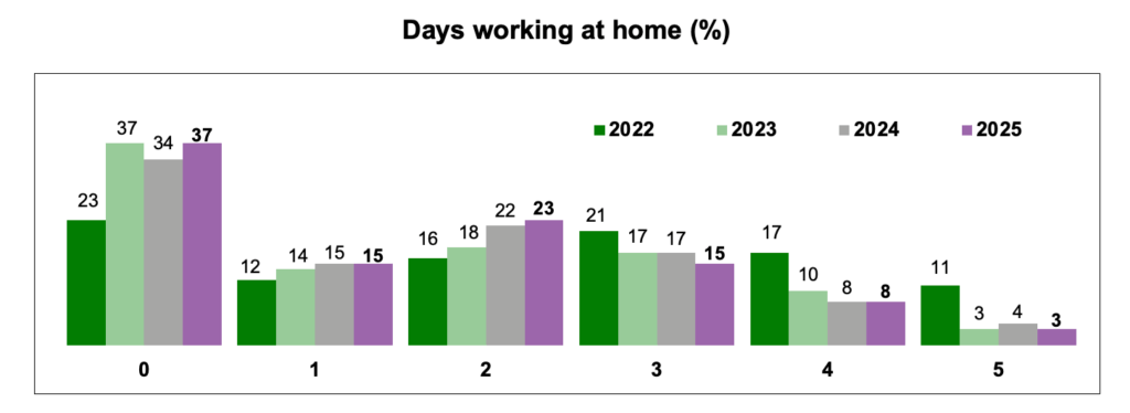 2.3 63% of people continue to work at home at least 1 day a week, this is down from 66% in 2024. 26% are working from home 3 or more days a week, this is down from 29% in 2024.