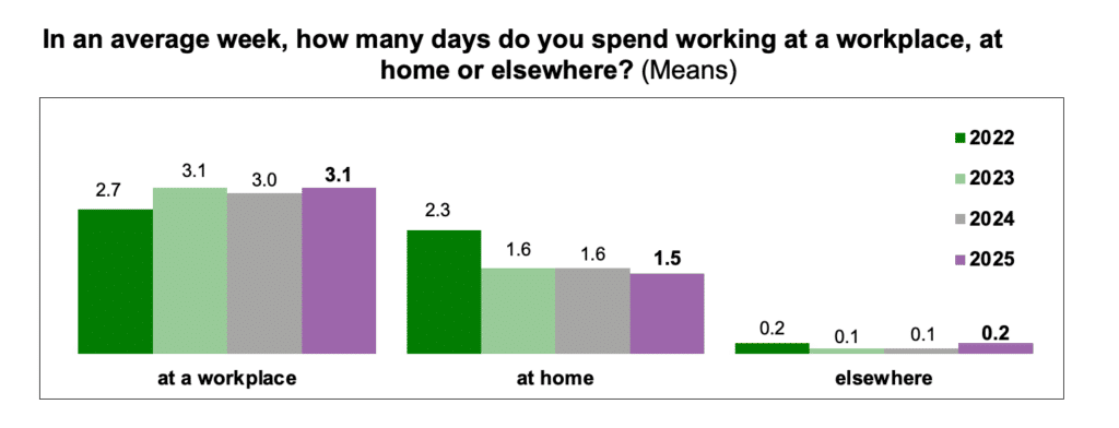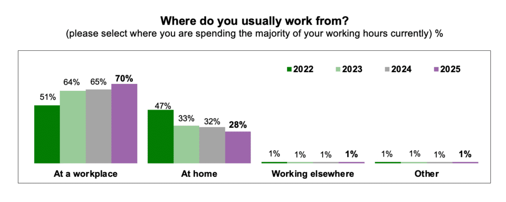 1. The % of people spending the majority of their time at their workplace continues to increase. 70% of respondents say they are spending the majority of their working hours at a workplace while 28% are spending the majority of their working hours at home. In 2024 the figures were 65% and 32% respectively and in 2023 they were 64% and 33%