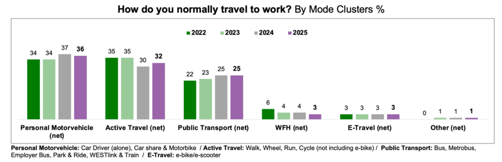 3. 36% of respondents are commuting by personal motor vehicle. 29% are driving alone by car (down from 31% in 2024), 6% are car sharing (up from 5% in 2024) and 1% are travelling by motorbike/moped (same as 2024).