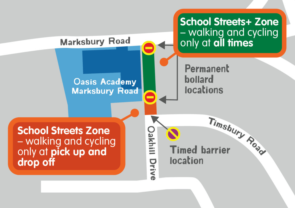 Advanced warning signs would be installed, and temporary barriers placed at the entrance to the timed closure on Oakhill Drive from the bollard up to the junction with Timsbury Road (marked in orange) that would only be accessible to school staff when closed.