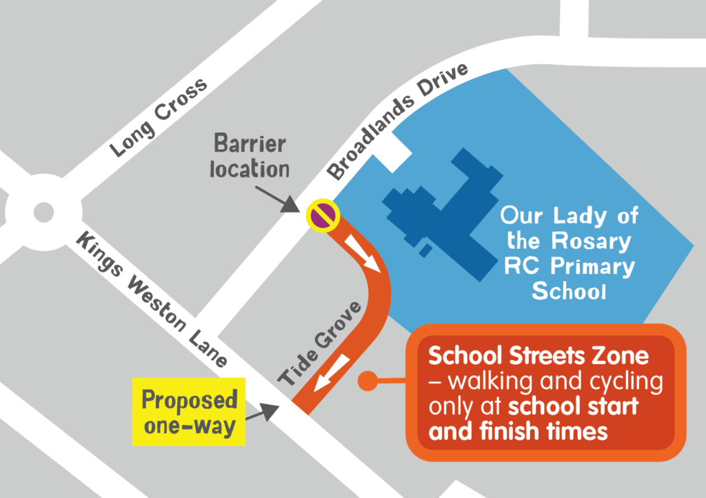 • To reduce traffic danger and congestion in the area, Bristol City Council is proposing to turn Tide Grove into a walking, wheeling, cycling and scooting-only zone at school start and finish times.